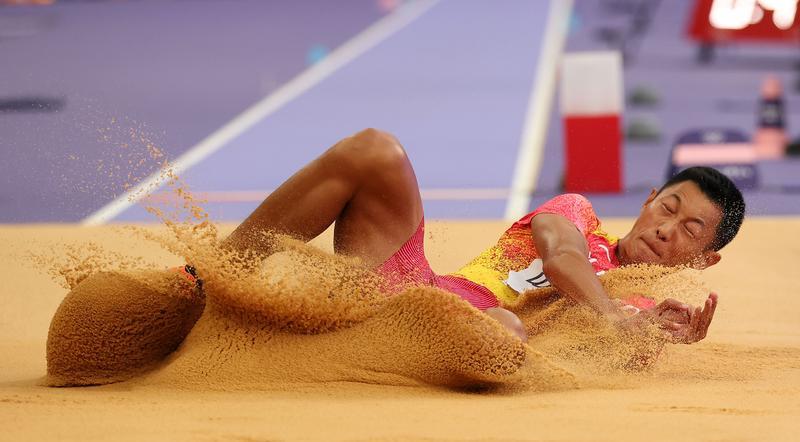 2024年8月6日,王嘉男在比赛中。当日,巴黎奥运会田径男子跳远决赛在法兰西体育场举行。新华社记者 李明 摄