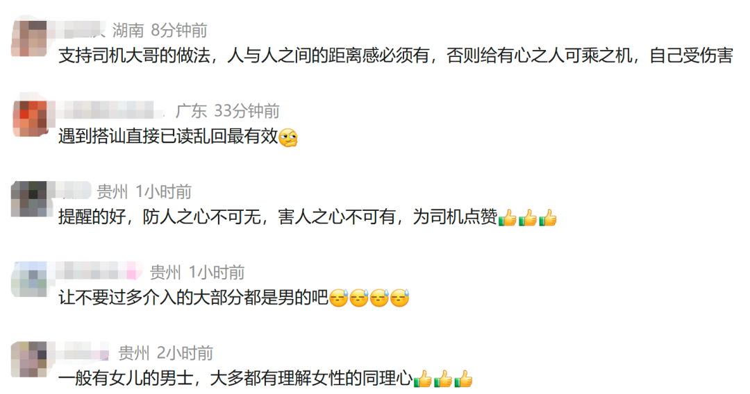 视频发出后,也有很多网友留言对韩先生的行为点赞,但也有人表示不应该过多介入。对此,韩先生表示自己当时完全是本能反应:“我当时完全没有考虑别的,我本能就觉得应该提醒,不提醒我回家肯定会后悔,她(女孩)也是我的乘客,我是她的司机要对她的安全负责,我自己也有两个女儿。”